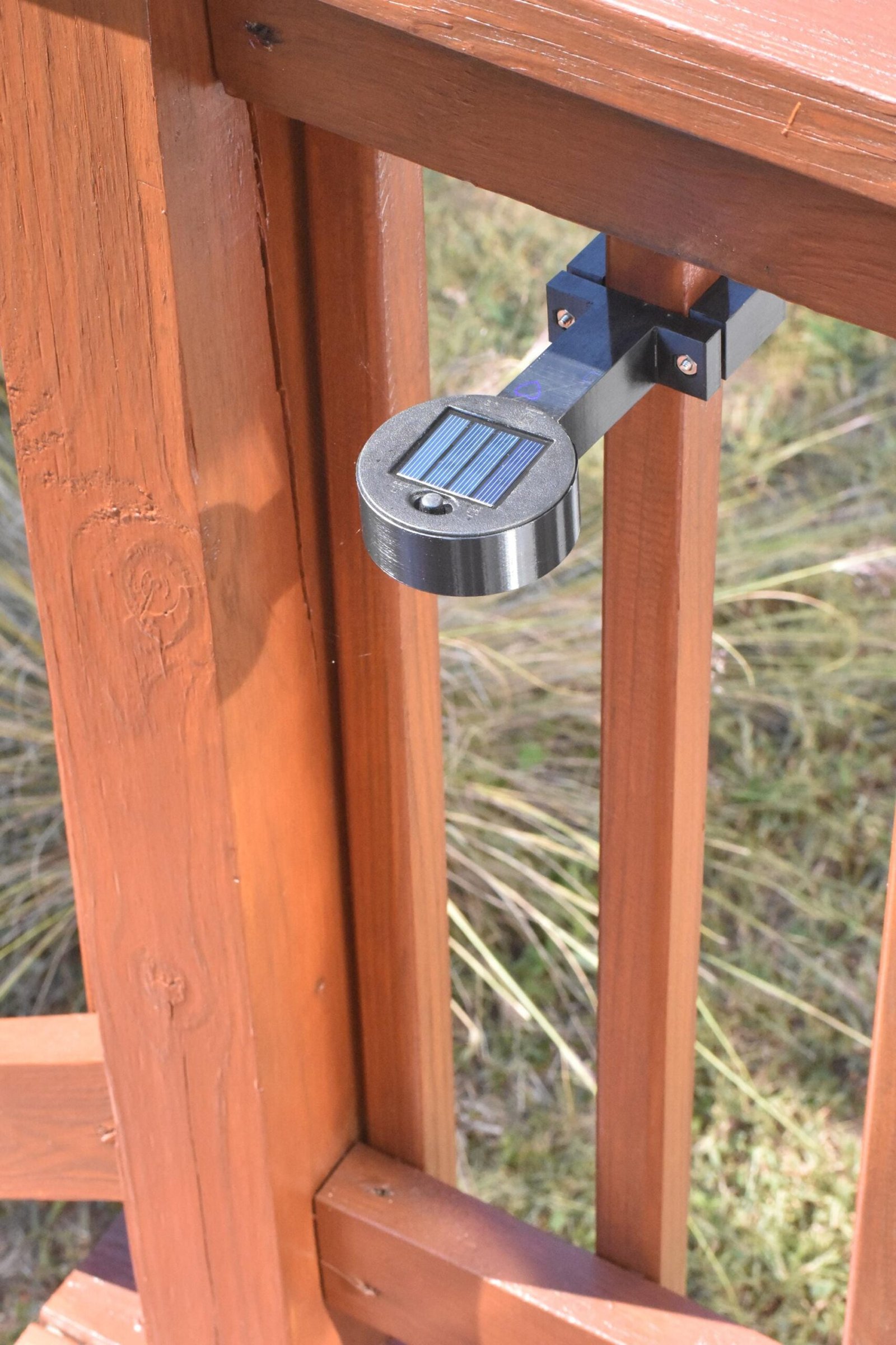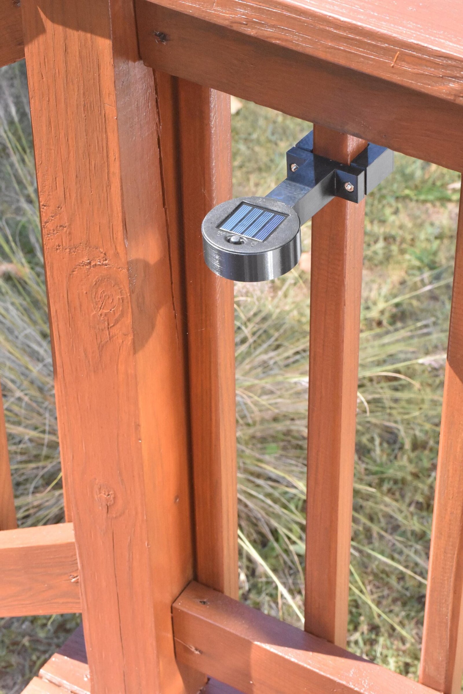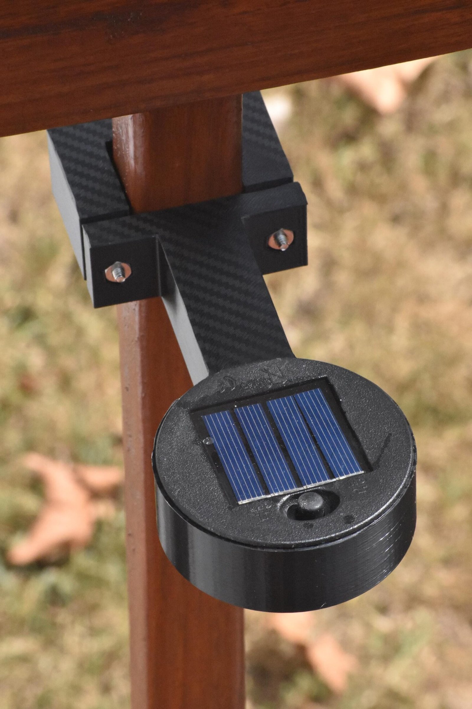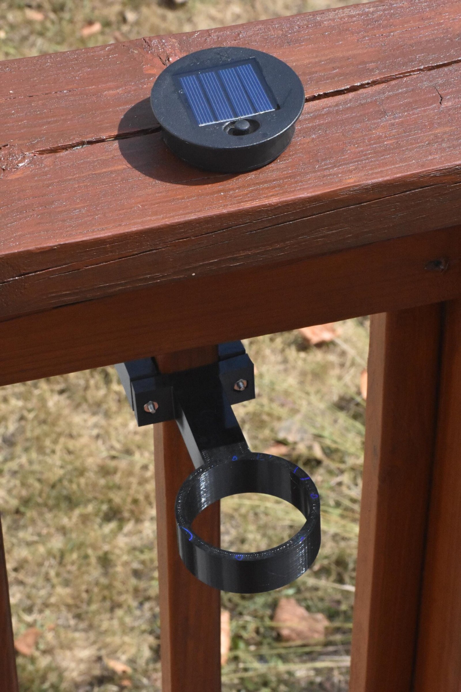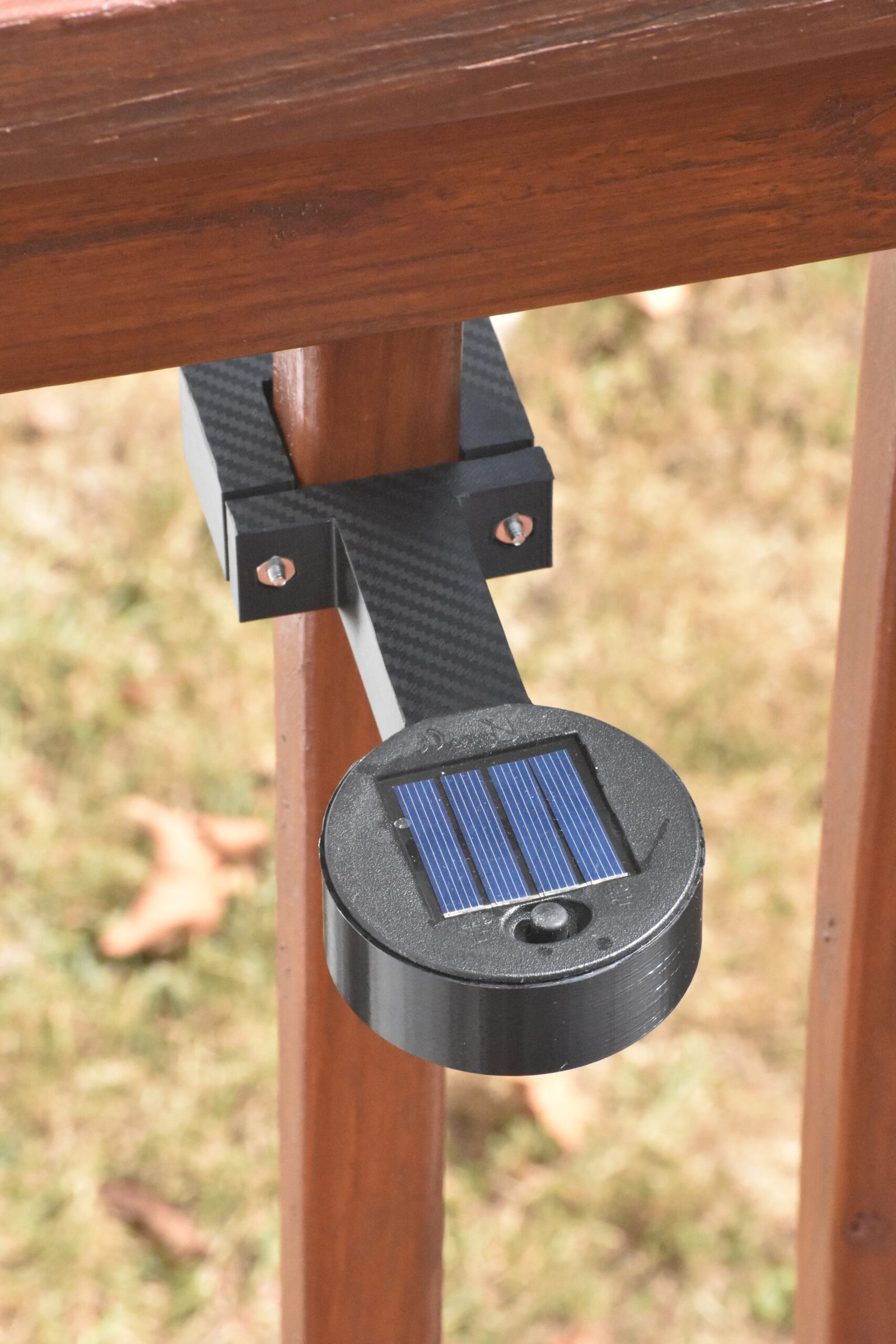 2 Unique 3D Printed Porch Lighting. Attaches to your porch railing. Solar lights are included and easily removed if needed for charging. A holographic pattern reflects in lights. Quite unique. Two reflective holographic patterns are offered with more on the way. Hearts and Carbon Fiber.  Solar panel removes in seconds to allow it to be charged if it’s in a low light area.