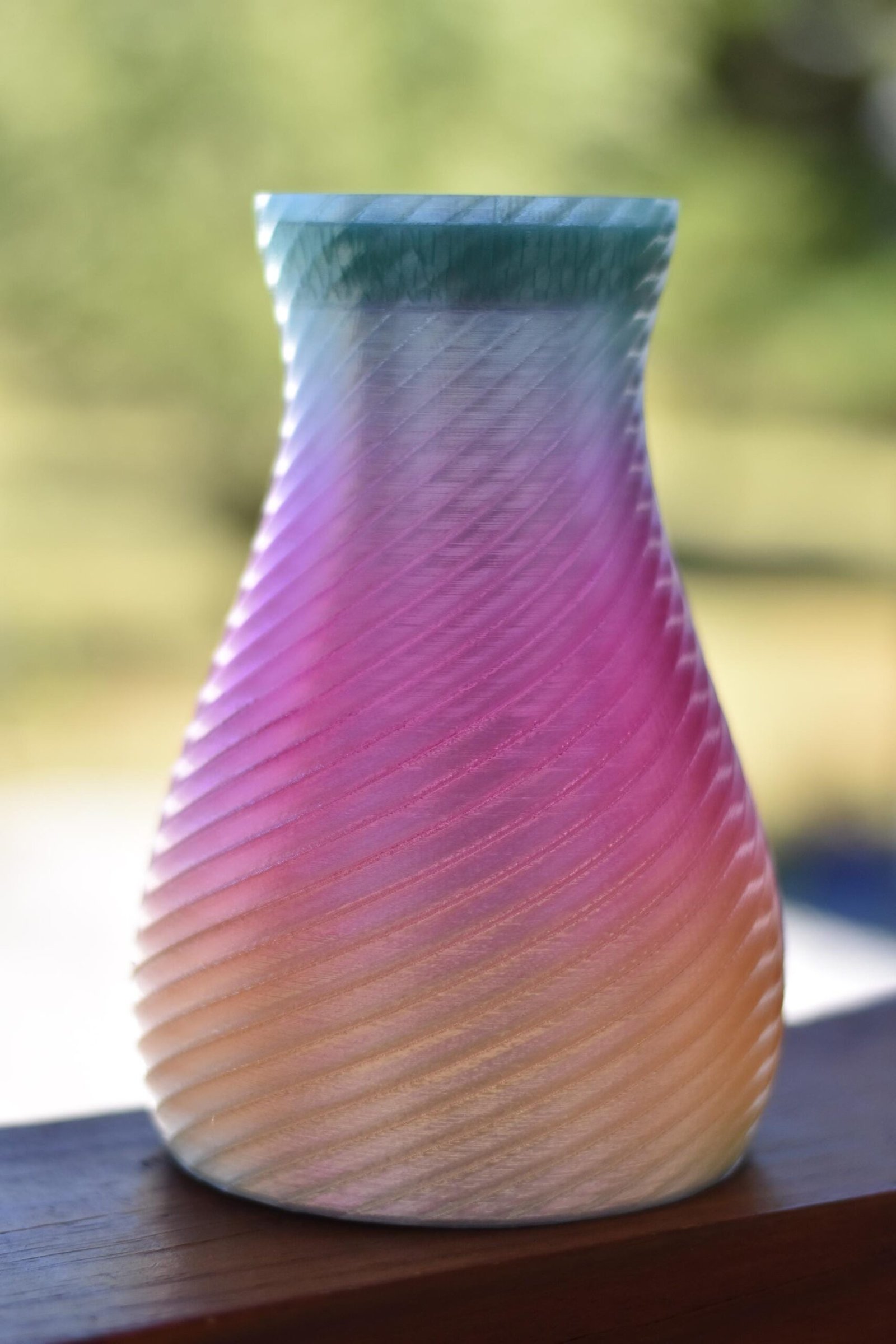 3D Printed Solar Vase. 7.6 tall x 5.27 wide. Solar light is included. Every vase has a slightly different place where the colors change. Safe for outdoor use. Can withstand temperatures up to 176-185 degrees fahrenheit before it starts to deform. Each solar vase is unique.